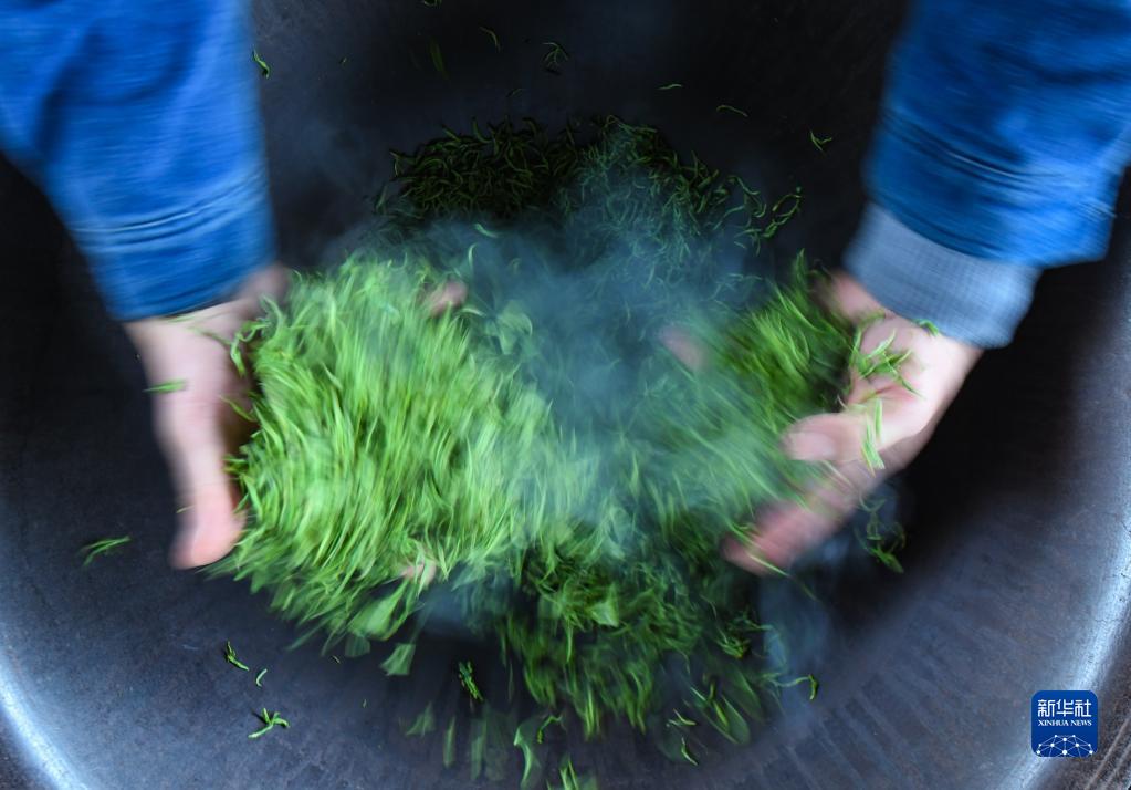 4月4日,在四川省汶川縣水磨鎮牛塘溝村,當地茶農在將茶葉炒青。