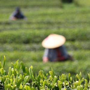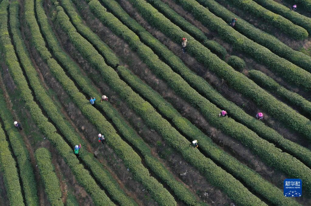 4月4日,茶農在貴州省黔東南苗族侗族自治州丹寨縣龍泉鎮馬寨茶園采摘明前茶(無人機照片)。