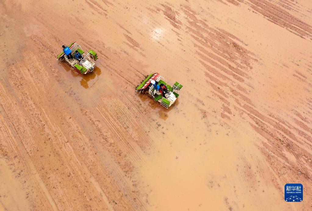 4月4日,四川省廣安市鄰水縣袁市鎮農民駕駛插秧機在田間作業(無人機照片)。