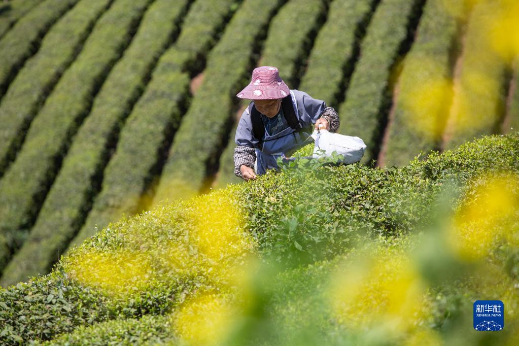 4月4日,茶農在貴州省安順市西秀區舊州鎮一茶園采摘明前茶。