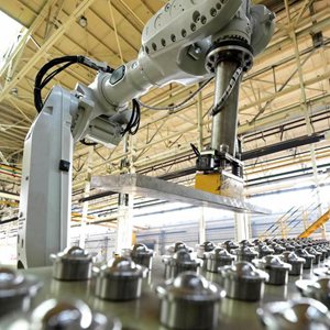 4月4日,秦皇島市山海關區中鐵山橋集團有限公司高速道岔墊板生產線上的機器人在工作中。