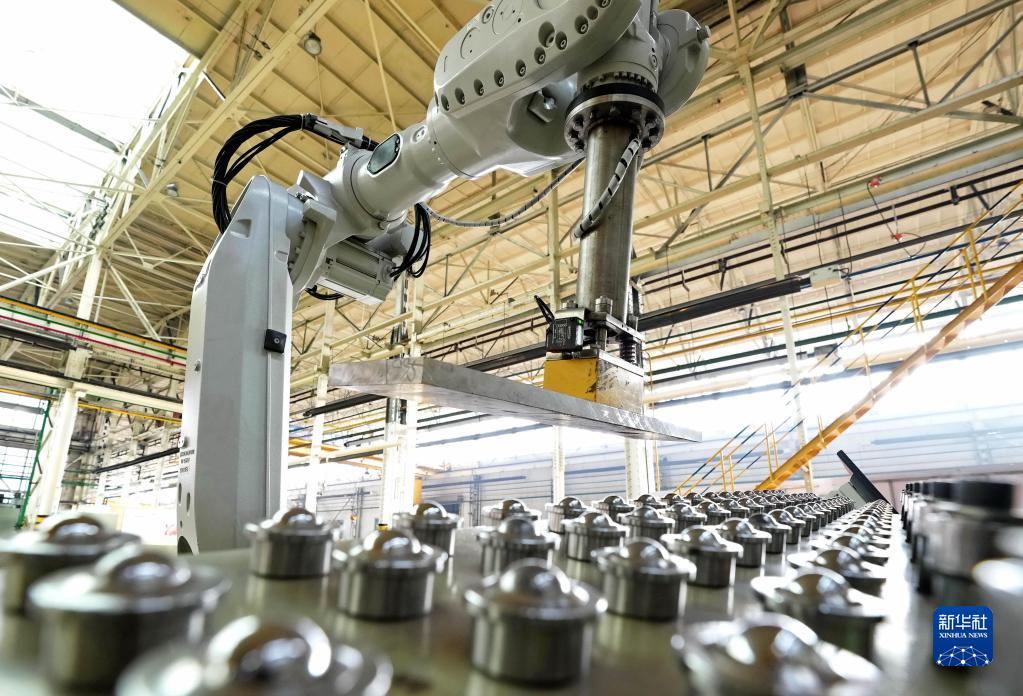 4月4日,秦皇島市山海關區中鐵山橋集團有限公司高速道岔墊板生產線上的機器人在工作中。