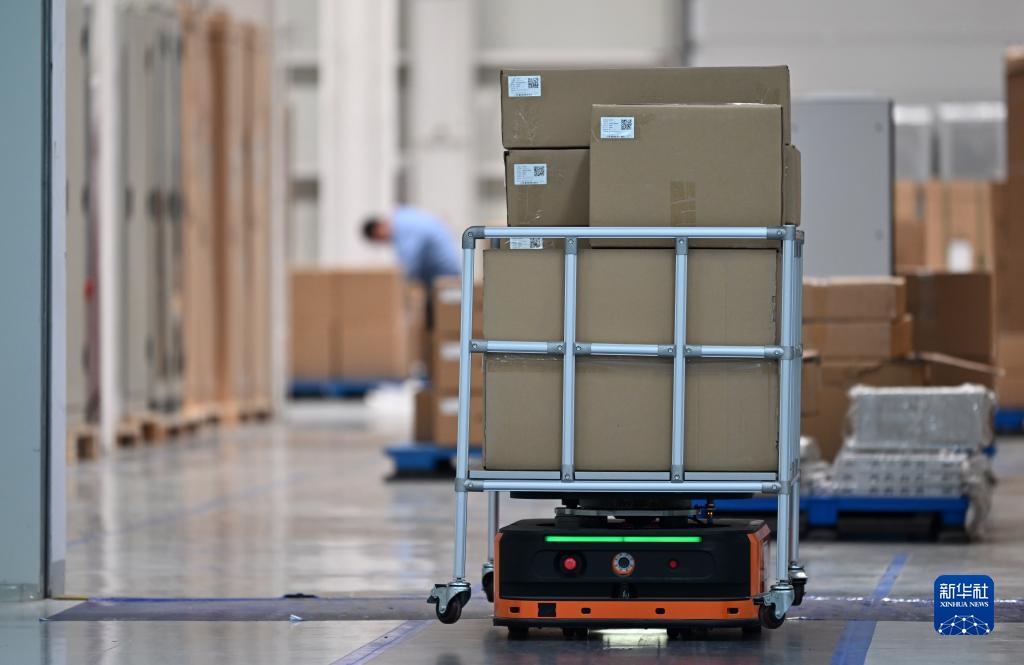 4月3日,運輸機器人在天津武清交控技術裝備有限公司的車間內作業。
