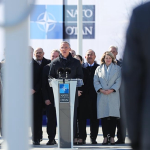 4月4日,在比利時布魯塞爾的北約總部,北約秘書長斯托爾滕貝格在芬蘭加入北約儀式上發言。