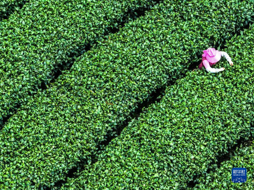 4月4日,茶農在遵義市湄潭縣永興鎮萬畝茶海內采摘茶葉。