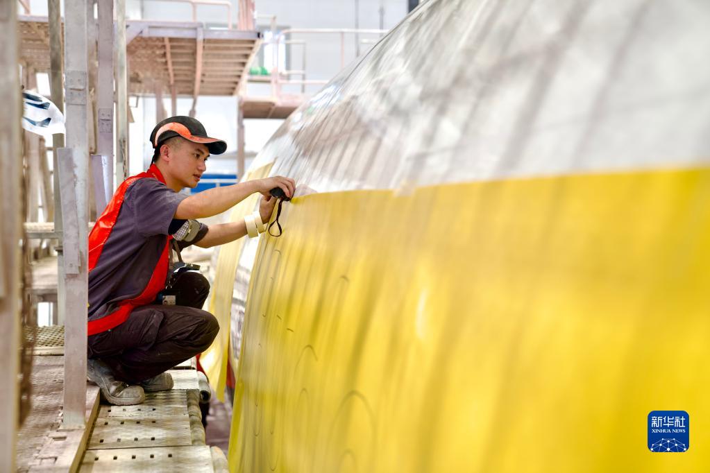 4月3日,在海南自貿港一站式飛機維修產業基地內,機務噴涂人員給進境飛機安裝機身噴涂模板。