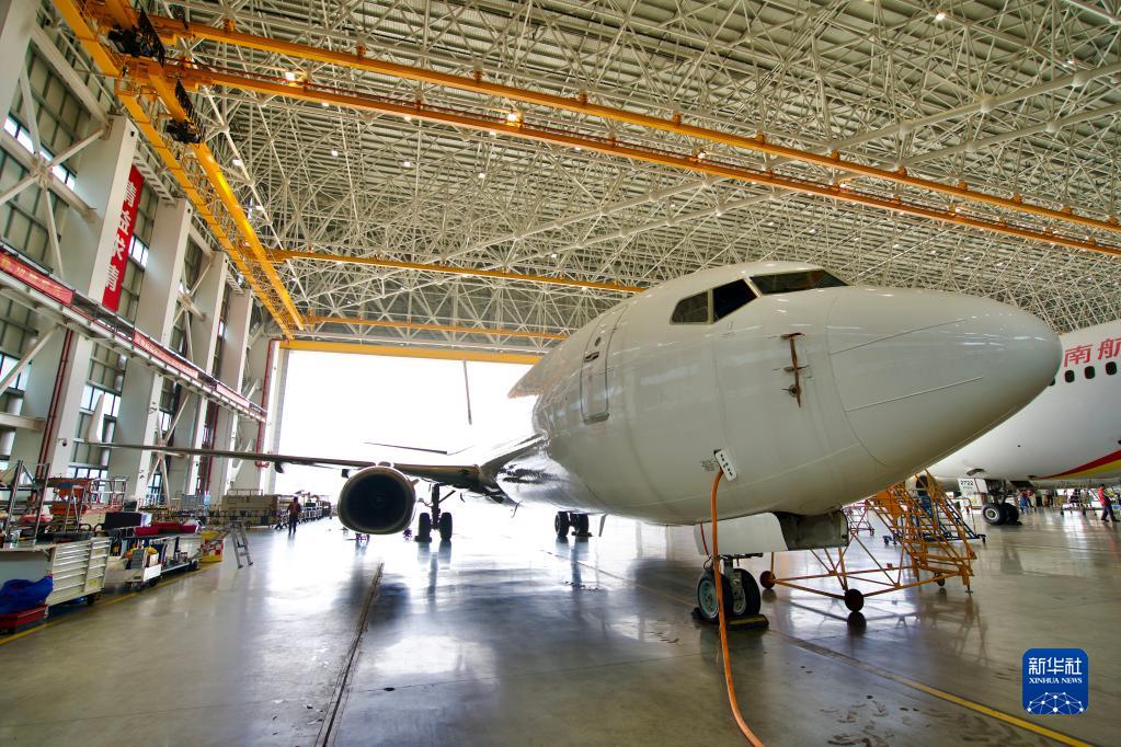 3月31日,在海南自貿港一站式飛機維修產業基地內,進境飛機接受飛機發動機、應急設備等多項檢修項目。