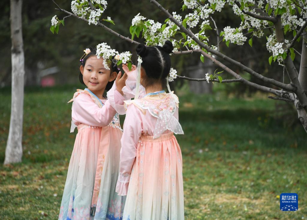 4月5日,小朋友在北京世界花卉大觀園游覽。