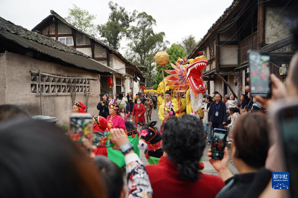 4月5日,游客在成都崇州市元通古鎮觀看“匯江老龍”巡游表演。
