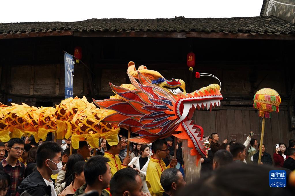 當日,崇州元通清明春臺會在四川成都崇州市元通古鎮拉開帷幕。由269人手舉269截龍身匯聚成的“匯江老龍”,在古街上巡游。