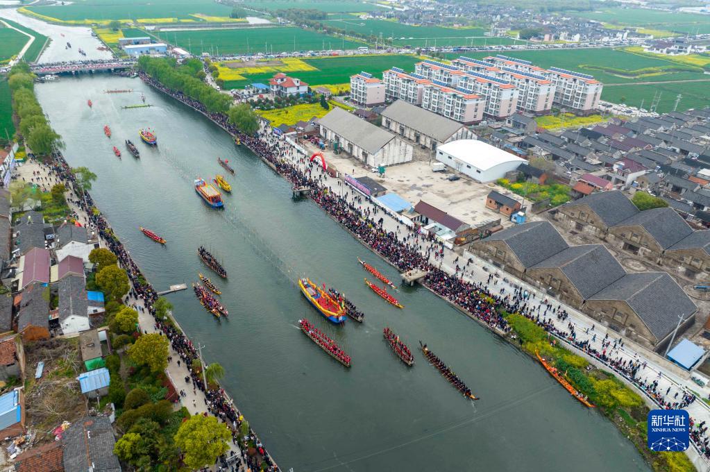 4月5日,各式船只在茅山西大河參加茅山會船(無人機照片)。