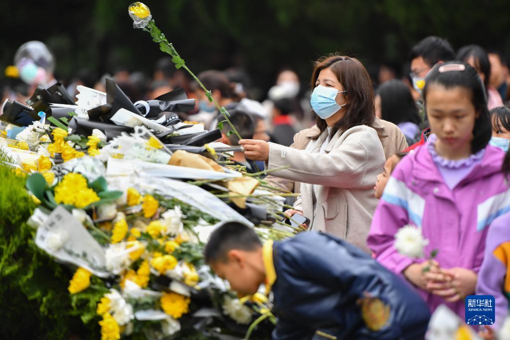 4月5日,市民在湖南烈士公園的紀念塔前獻花。