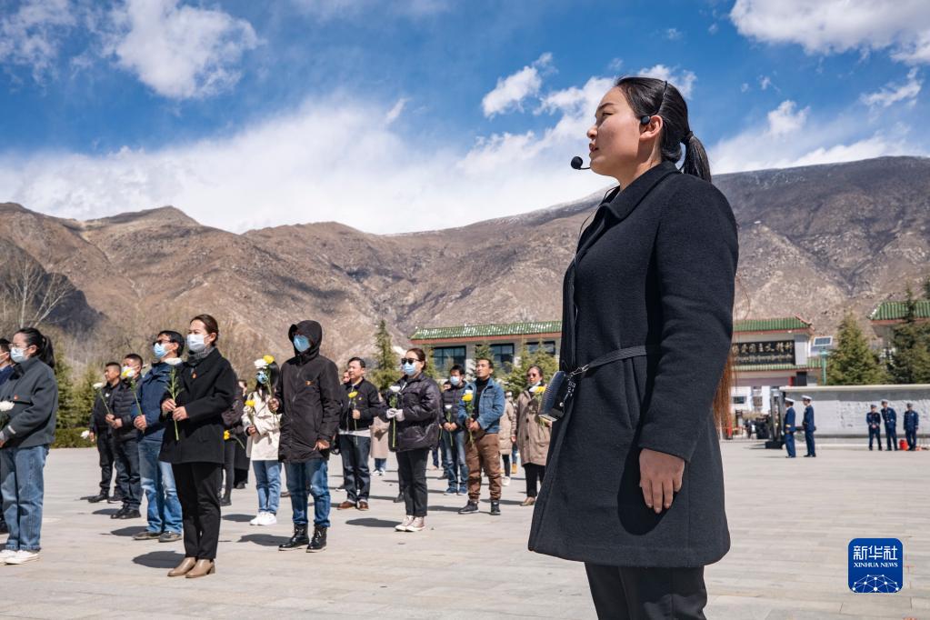 在拉薩烈士陵園,索朗拉姆主持默哀儀式(4月4日攝)。