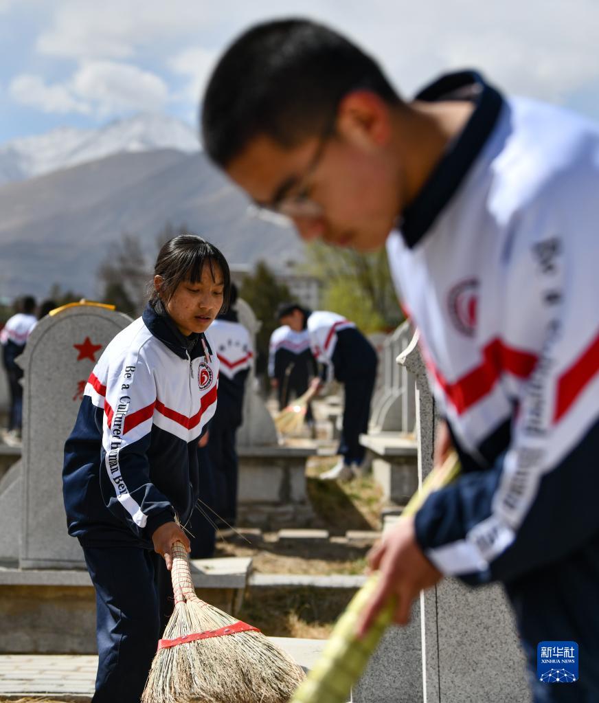 學生在拉薩烈士陵園掃墓(4月5日攝)。