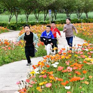 4月5日,游人在四川省廣安市岳池縣銀城花海踏青游玩。