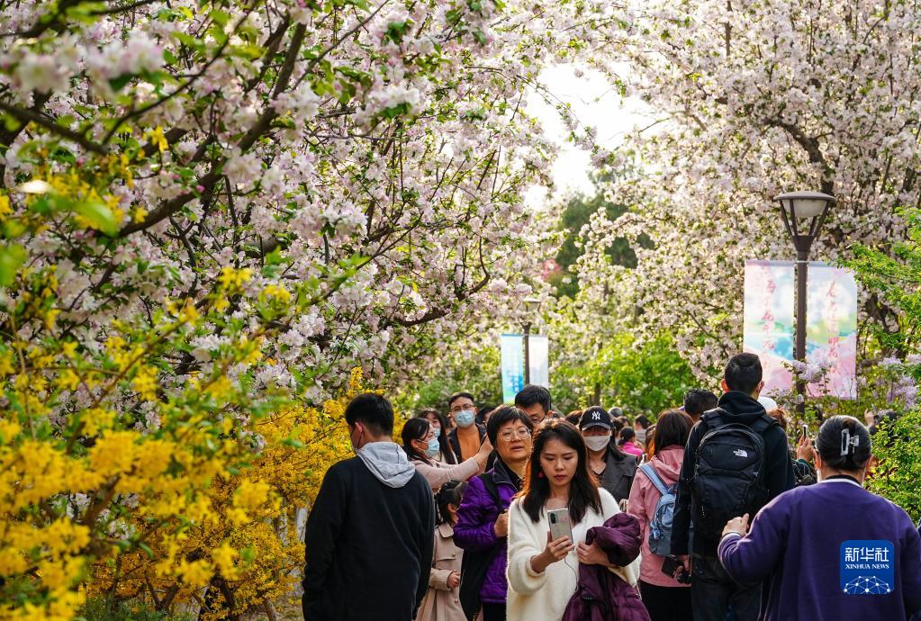 4月5日,人們在北京元大都城垣遺址公園賞花。