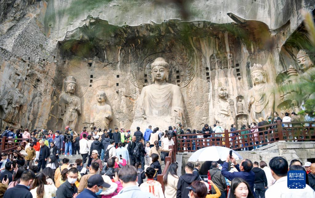 4月5日,游客在河南省洛陽市龍門石窟景區游覽。