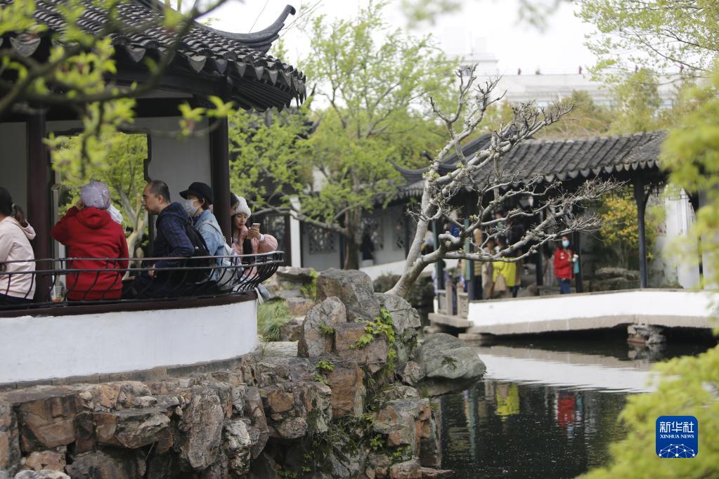 4月5日,游人在江蘇蘇州拙政園游玩。