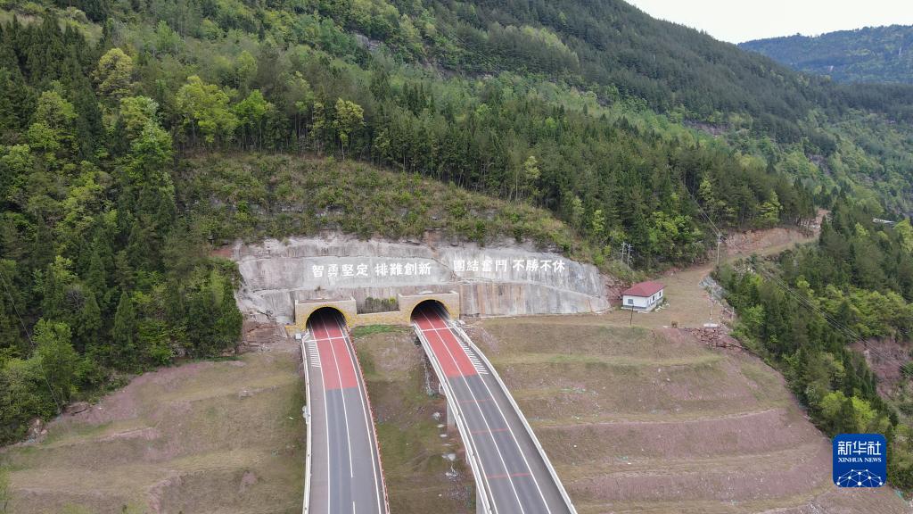 這是4月5日拍攝的鎮廣高速公路王坪至通江段一隧道口,上面裝飾有當年紅軍在巴中毛浴鎮政府院壩前的青石墻上鏨刻的“智勇堅定、排難創新、團結奮斗、不勝不休”十六字訓詞(無人機照片)。