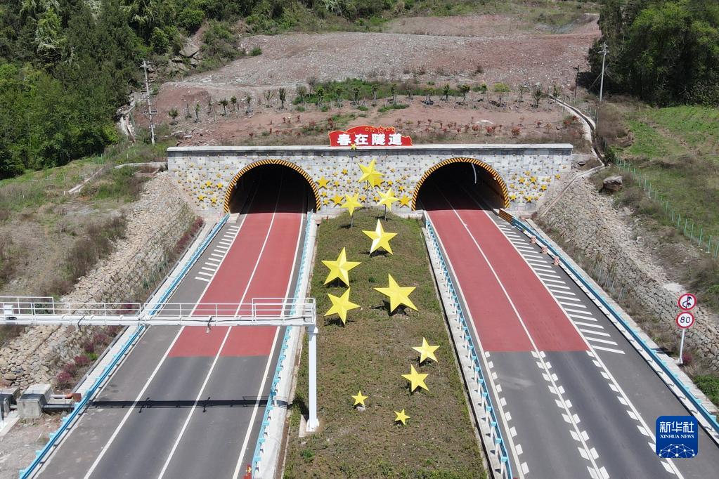 這是4月4日拍攝的鎮廣高速公路王坪至通江段春在隧道口(無人機照片)。