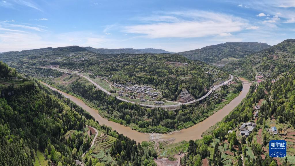 這是4月4日拍攝的鎮廣高速公路王坪至通江段王坪高速出口前往川陜革命根據地紅軍烈士陵園的道路(無人機全景照片)。