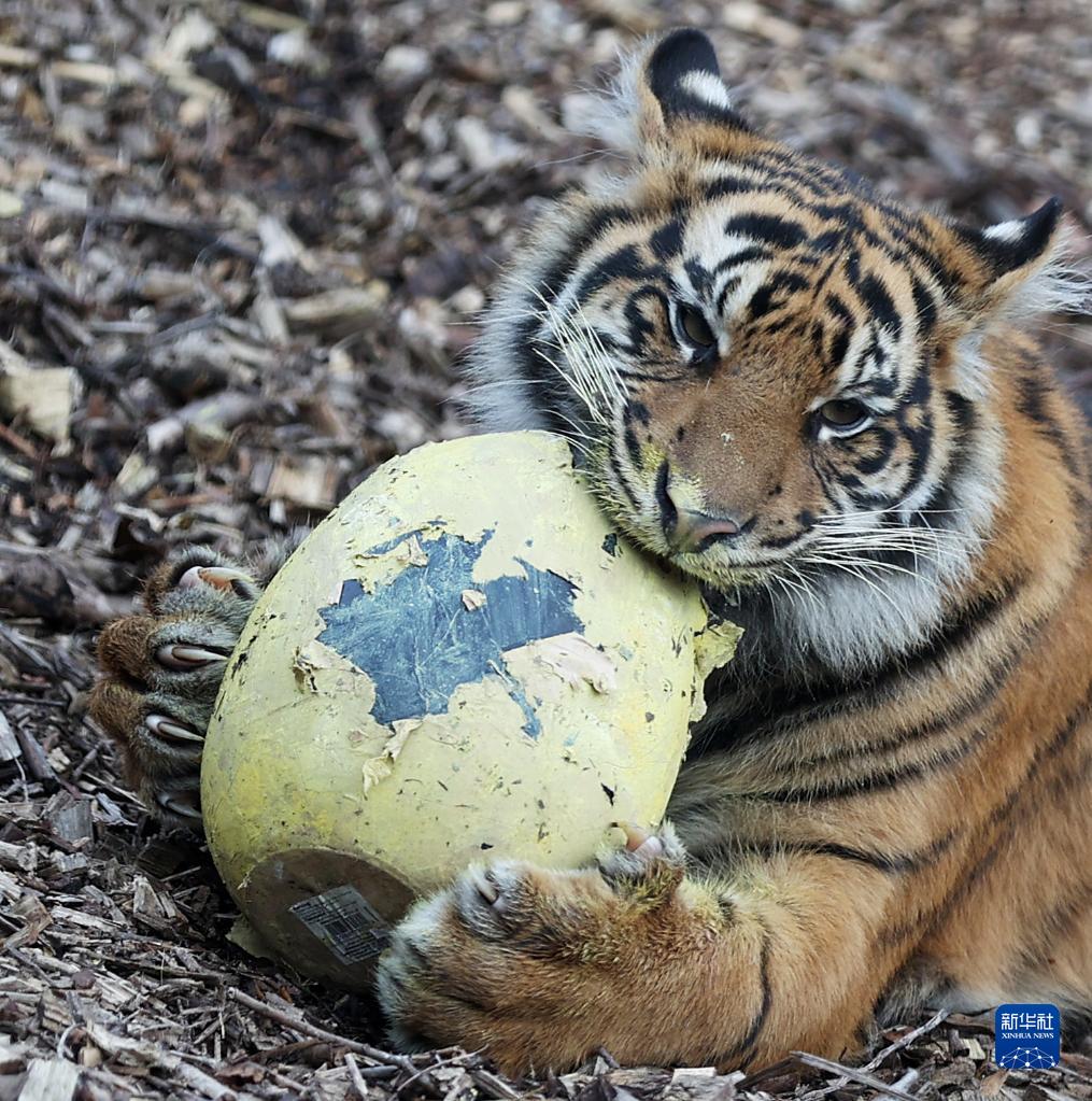 4月5日,在英國倫敦動物園,一只蘇門答臘虎享用“彩蛋大餐”。