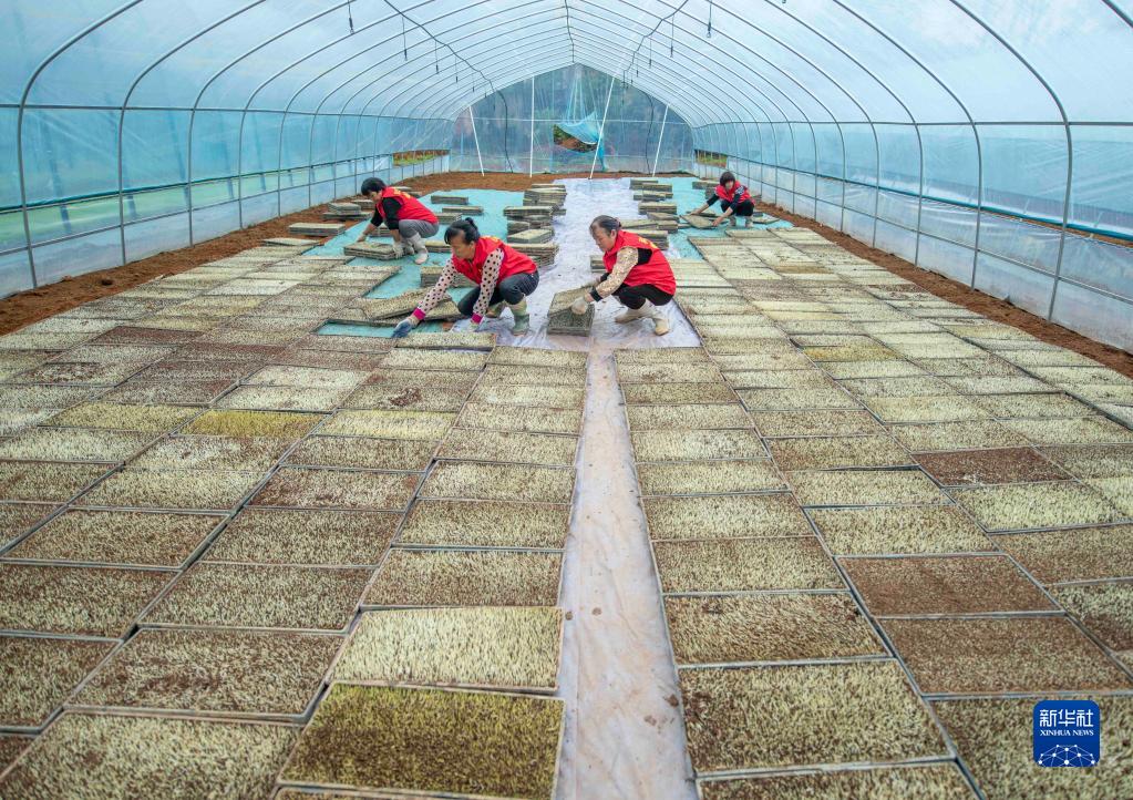 4月5日,在湖南省永州市道縣上關街道向陽村,農民在和豐農機專業合作社育秧基地擺放秧盤。