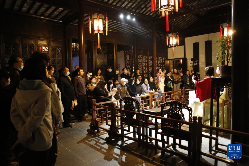 近年來,江蘇省蘇州市網師園通過數字化展示手段,結合江南絲竹演奏、昆曲、評彈等傳統曲藝表演,不斷探索園林夜游發展新模式,將古典美學融入現代生活,為游客展示夜間的園林魅力。