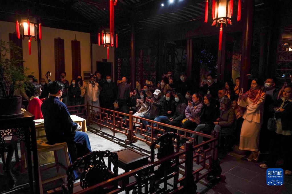近年來,江蘇省蘇州市網師園通過數字化展示手段,結合江南絲竹演奏、昆曲、評彈等傳統曲藝表演,不斷探索園林夜游發展新模式,將古典美學融入現代生活,為游客展示夜間的園林魅力。