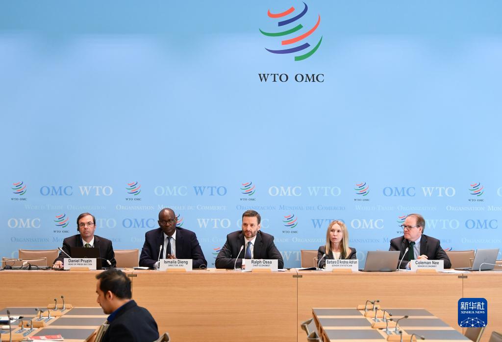 4月5日,在瑞士日內瓦的世貿組織總部,世貿組織首席經濟學家拉爾夫·奧薩(中)在新聞發布會上講話。
