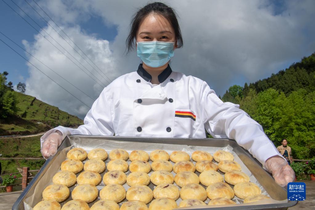 4月6日,工作人員展示新鮮出爐的特色小吃“牡丹餅”。
