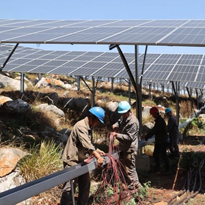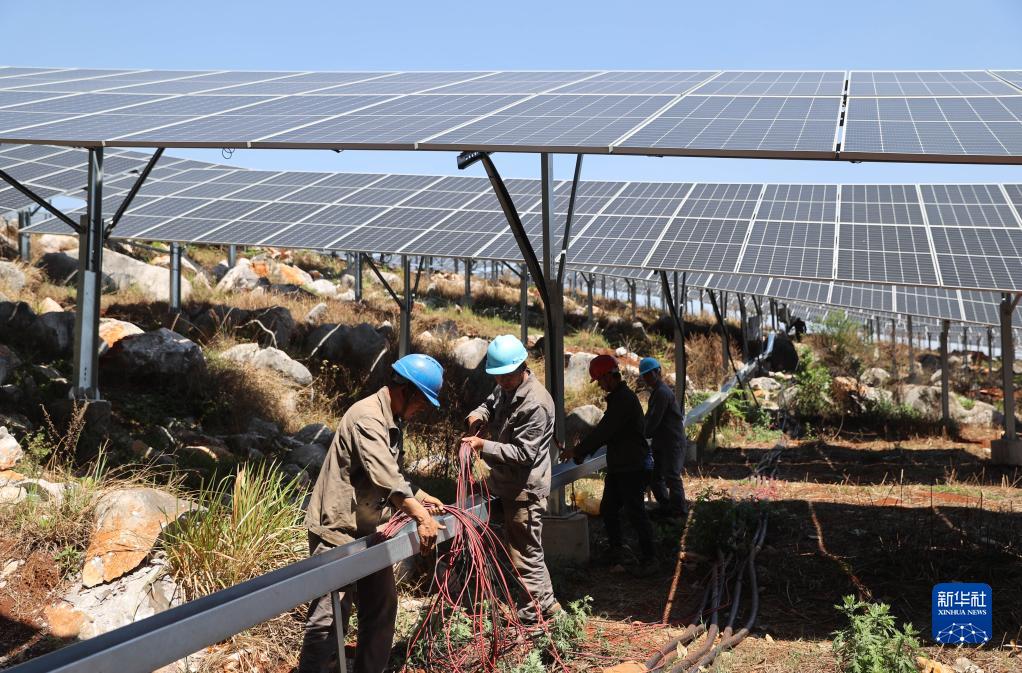 4月6日,工人在硯山縣平遠小石巖光伏電站安裝電線。