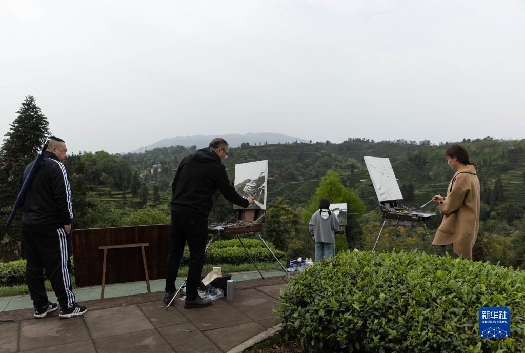 4月6日,幾名繪畫愛好者來到青杠坪村茶園里寫生。