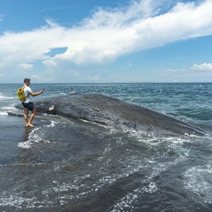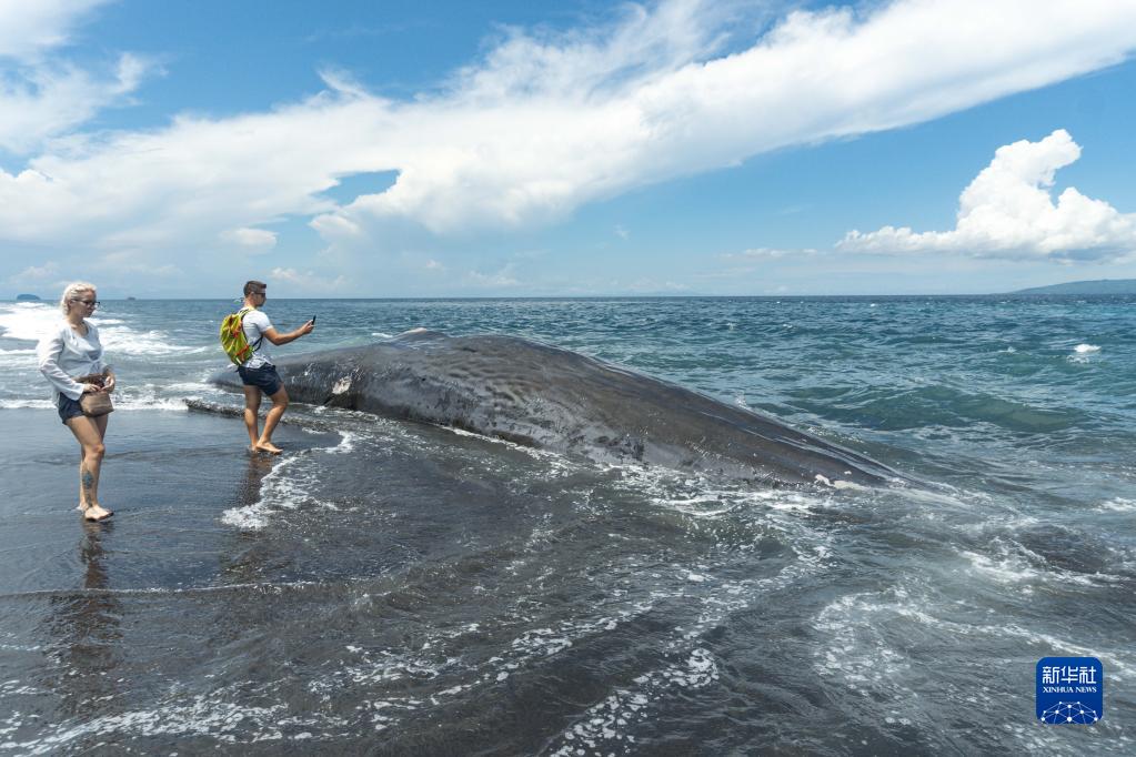 4月6日,在印度尼西亞巴厘島克隆孔,人們圍觀抹香鯨的遺體。