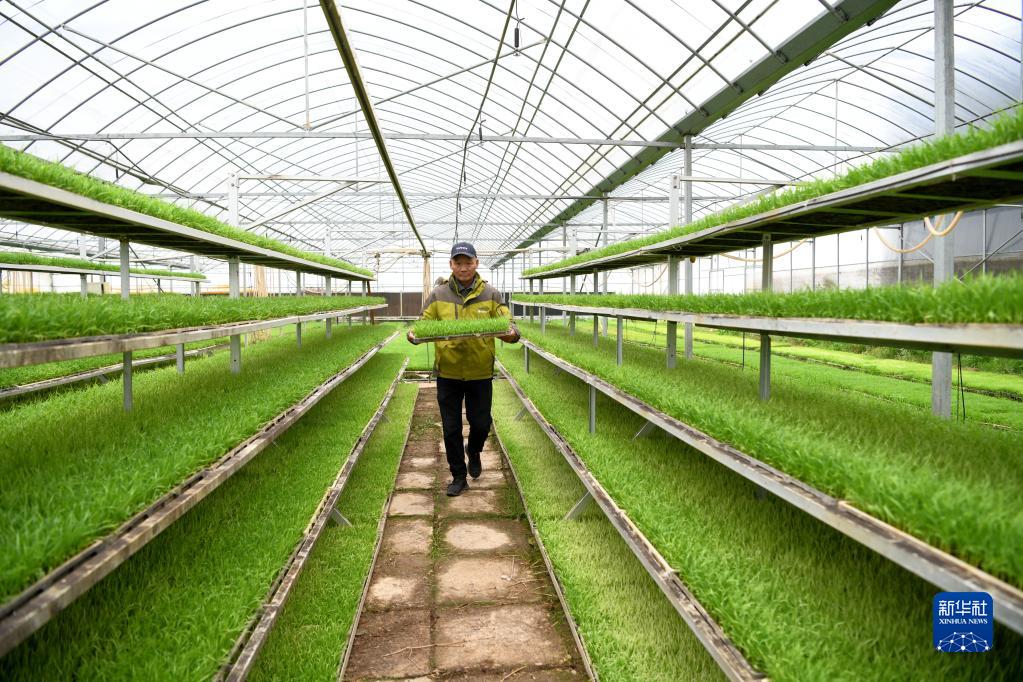 4月6日,在江西省南昌縣蔣巷鎮大田農社,育秧大棚內工作人員將長勢較好的秧苗移至秧田。