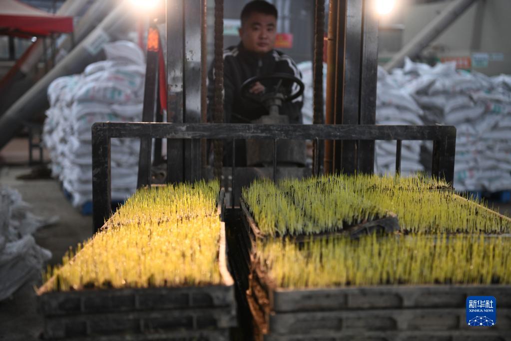 4月6日,在江西省南昌縣蔣巷鎮大田農社育秧生產車間,工人駕駛叉車轉運暗化催芽好的秧苗。