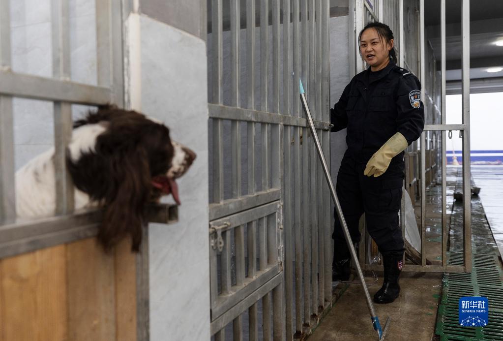4月3日,警犬康欣看著劉欣打掃犬舍。新華社記者 費茂華 攝