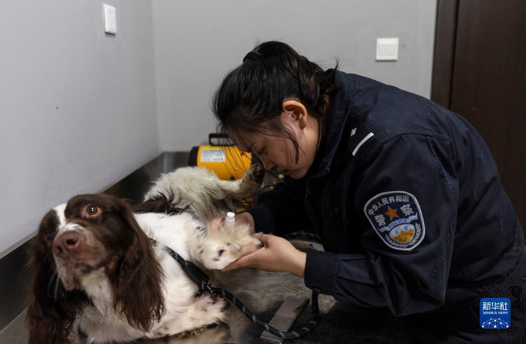 4月3日,劉欣給警犬康欣腳上的傷口抹藥。新華社記者 費茂華 攝