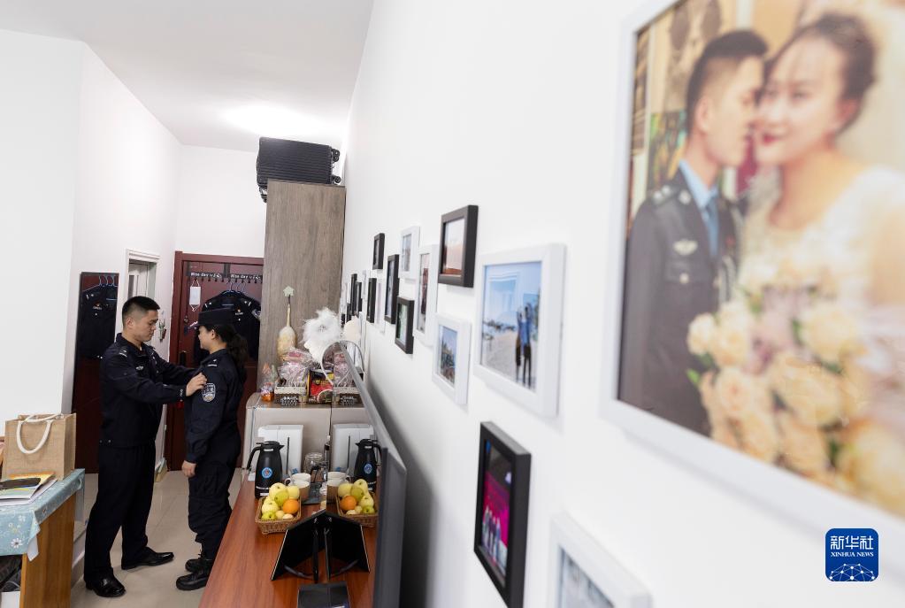 4月4日,崔洪武(左)幫助劉欣整理著裝。新華社記者 費茂華 攝