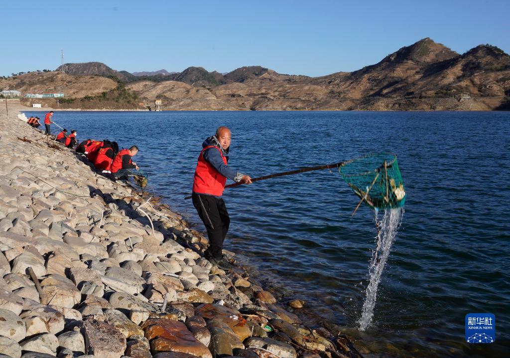 4月7日,河北省遵化市湯泉滿族鄉的志愿者在上關湖岸邊清理雜物。