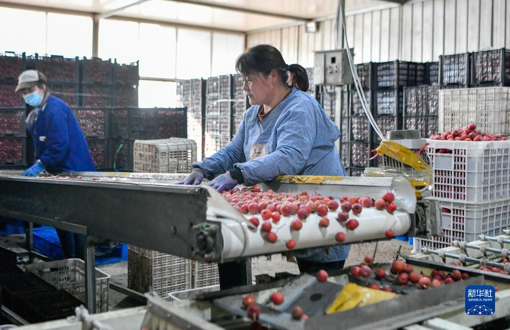 4月6日,在天津市薊州區下營鎮野森家庭農場,工人對山楂進行初篩。