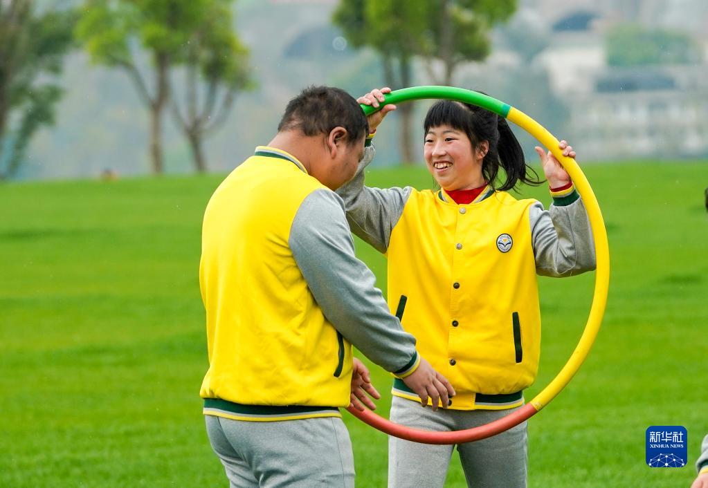 3月31日,重慶廣陽島的一片草地上,重慶市特殊教育中心視力障礙學生們在玩呼啦圈。