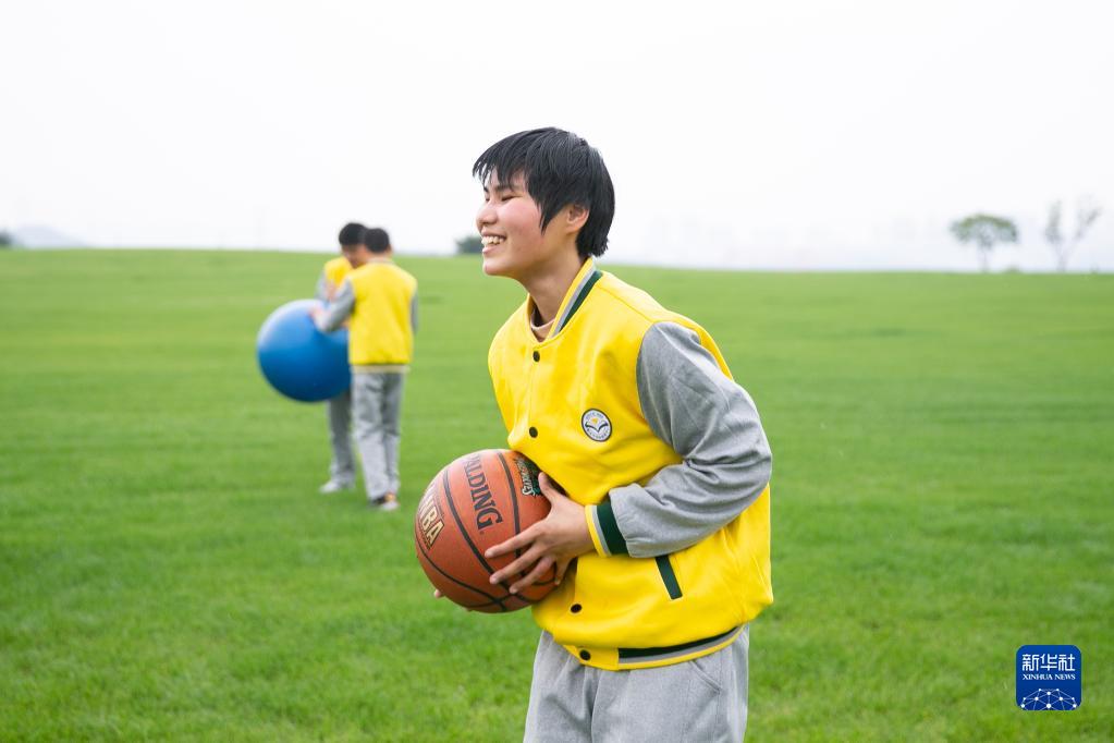 3月31日,在重慶廣陽島,重慶市特殊教育中心的視力障礙學生在草坪上玩籃球。