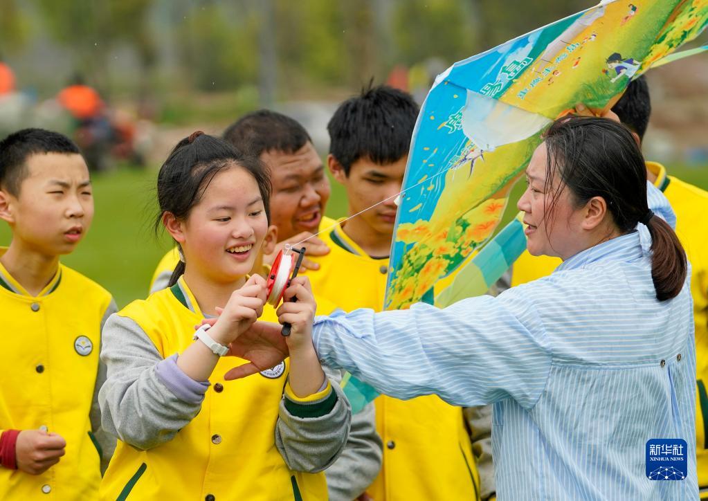 3月31日,重慶廣陽島的一片草地上,重慶市特殊教育中心的老師李英(右一)在指導視力障礙學生如何放風箏。