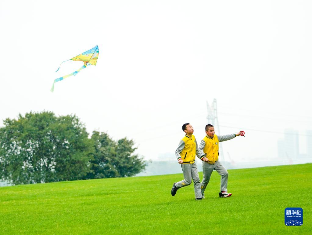 3月31日,重慶廣陽島的一片草地上,兩名重慶市特殊教育中心視力障礙學生牽著手放風箏。