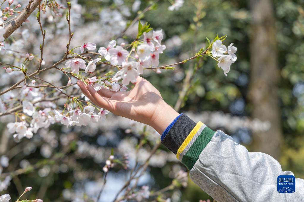 3月14日,重慶市特殊教育中心的視力障礙學生在重慶市南山植物園輕輕觸摸花朵。