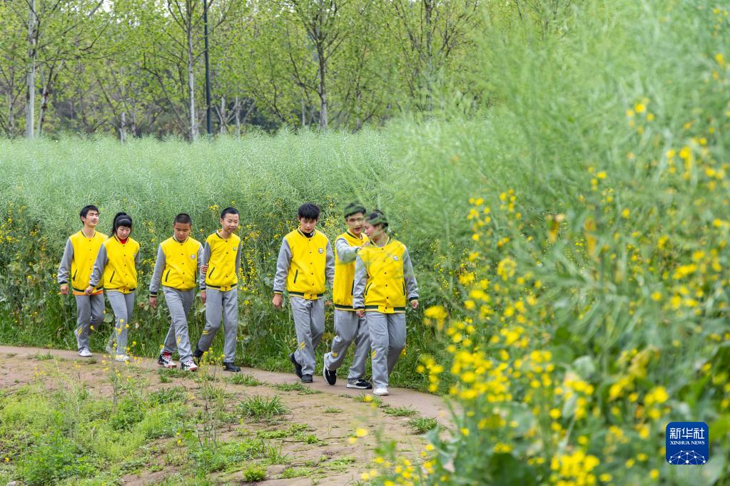 3月31日,在重慶廣陽島,重慶市特殊教育中心的視力障礙學生行走在油菜田中。