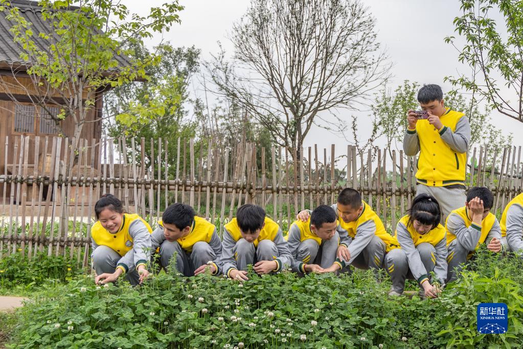 3月31日,在重慶廣陽島,重慶市特殊教育中心的視力障礙學生輕輕觸摸植物綠葉,感受春的氣息。