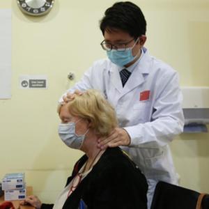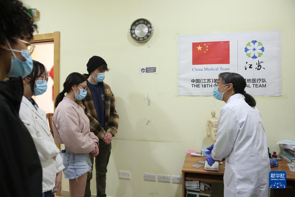 4月5日,在馬耳他保拉市地中海地區中醫中心,中國第18期援馬耳他醫療隊成員給學生講解針灸治療。