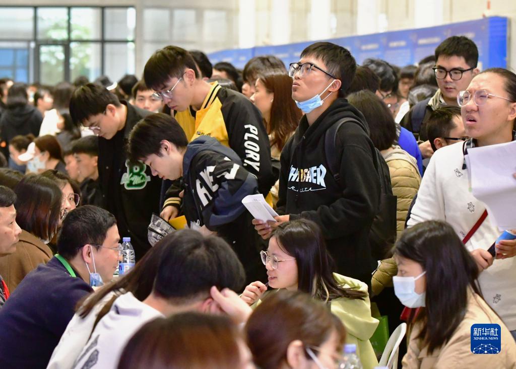 4月7日,高校畢業生在招聘會現場咨詢崗位信息。